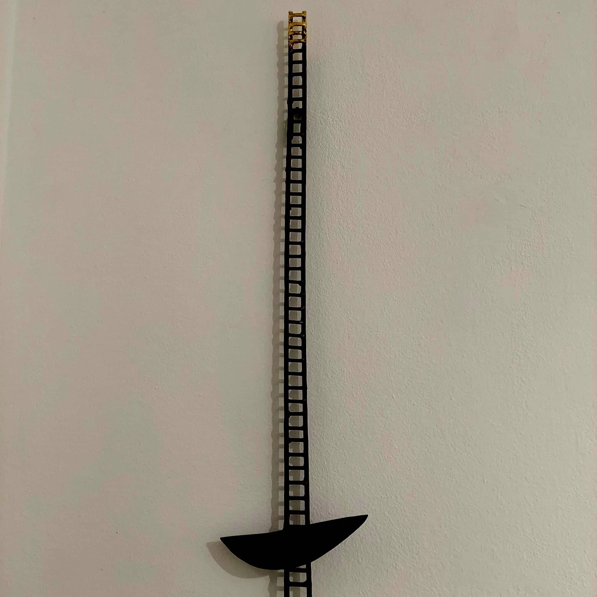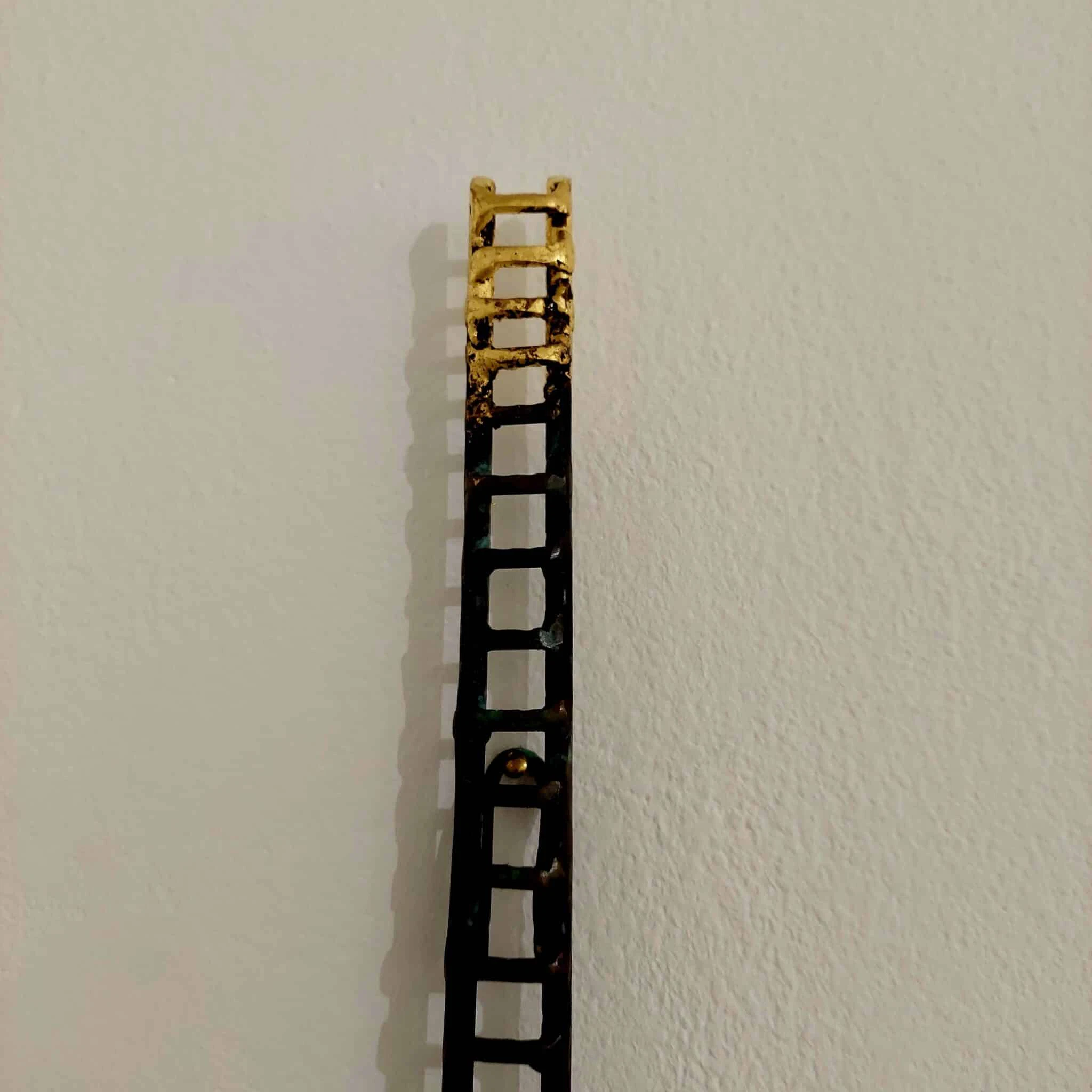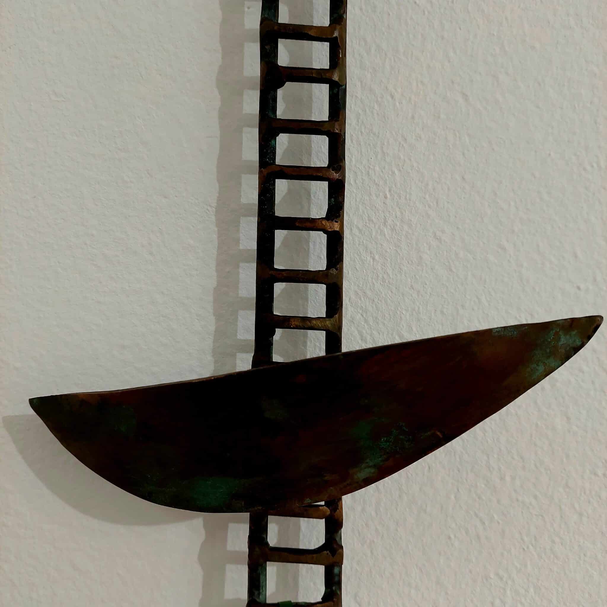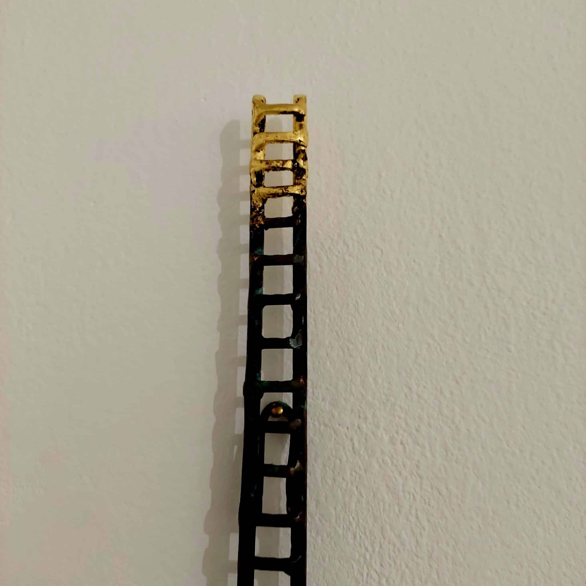 Die Objekte von Basilius Kleinhans greifen auf eine klare, symbolisch aufgeladene Formensprache zurück. In Bronze mit Blattgold gestaltet, kreisen sie um universelle Motive wie Boote, Häuser und Leitern, rufen Erinnerungen an mythische Erzählungen wach und öffnen Räume für persönliche Assoziationen. Das Boot etwa wird zum Zeichen für Übergänge, Leitern, die wie hier häufig Teil der Komposition sind, lassen sich als Einladung zum Aufstieg oder gar zum Überschreiten von Grenzen verstehen – sowohl räumlich als auch symbolisch.
