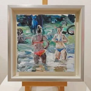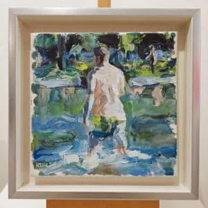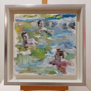 Die Arbeiten von Markus Kurscheidt erzählen von Augenblicken. Es sind Szenen, die kostbare Momente einfangen und deren Atmosphäre festhalten. Einen wesentlichen Anteil an der besonderen Stimmung in Kurscheidts Bildern hat die Kombination aus Realismus und Abstraktion: Der Untergrund, auf dem die Helden seiner Bilder agieren, erschließt sich oftmals nur durch den Kontext. Ob Wasser, Kies oder Gras: Dünn aufgetragen fließt die Ölfarbe die Leinwand hinunter und bildet in der Verbindung zu den mit pastoser Farbe gemalten Figuren einen aufregenden Kontrast.