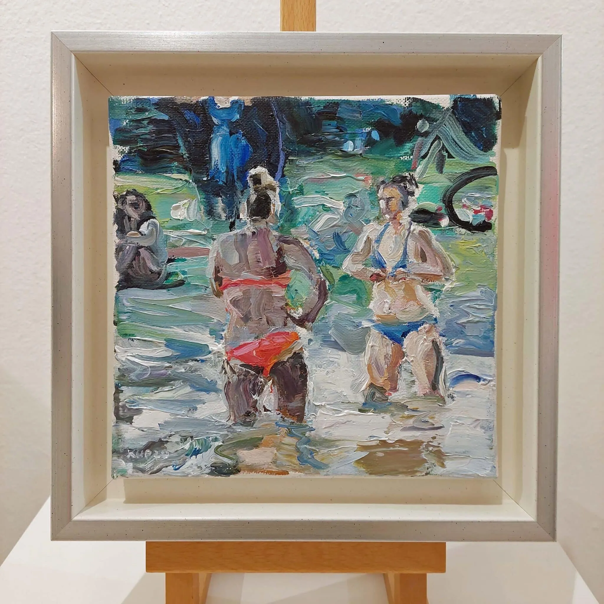 Die Arbeiten von Markus Kurscheidt erzählen von Augenblicken. Es sind Szenen, die kostbare Momente einfangen und deren Atmosphäre festhalten. Einen wesentlichen Anteil an der besonderen Stimmung in Kurscheidts Bildern hat die Kombination aus Realismus und Abstraktion: Der Untergrund, auf dem die Helden seiner Bilder agieren, erschließt sich oftmals nur durch den Kontext. Ob Wasser, Kies oder Gras: Dünn aufgetragen fließt die Ölfarbe die Leinwand hinunter und bildet in der Verbindung zu den mit pastoser Farbe gemalten Figuren einen aufregenden Kontrast.