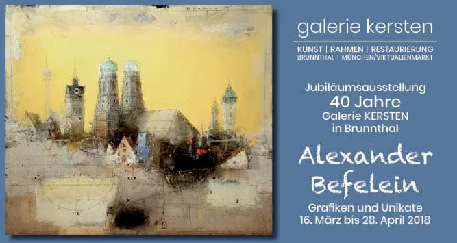 Bis zum 28. April 2018 zeigten wir in unserer Jubiläumsausstellung anlässlich des 40-jährigen Bestehens unserer Galerie in Brunnthal Werke von Alexander Befelein. Der unverwechselbare Malstil des renommierten und international bekannten Münchner Künstlers zeugt von seinem ganz eigenen Blick auf die Welt. Seine Faszination für die städtische Architektur bringt er mit großer Detailverliebtheit und meisterhafter Linienführung aufs Papier.