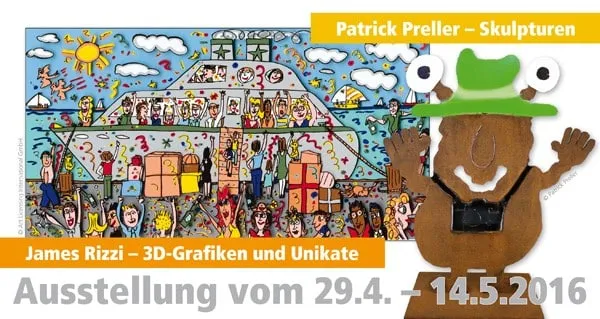Vom 29. April bis zum 14. Mai 2016 präsentierten wir Highlights aus dem Œuvre des 2011 verstorbenen Popart-Künstlers James Rizzi. Ausgestellt wurden auch sein Zeichentisch und weitere Gegenstände aus seinem New Yorker Atelier. Wie kaum ein anderer schaffte er es, Lebensfreude und Lebenslust künstlerisch umzusetzen. Begleitet wurden die Bilder von ebenso farbenfrohen Skulpturen und Objekten des Künstlers Patrick Preller.