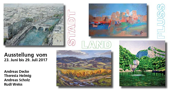 Vom 23. Juni bis zum 29. Juli 2017 präsentierten wir Landschaften und Städte individuell interpretiert von den Künstlern Andreas Decke, Theresia Helmig, Andreas Scholz und Rudi Weiss. Ob gegenständlich oder abstrakt, bewusst verfremdet, impressionistisch oder expressiv – allen Bildern gemein war, dass sie den Betrachter an ihm bekannte und doch neue (Stadt-)Landschaften entführen, ihn an besondere, intensive Erlebnisse, Momente und Stimmungen erinnern und seine Umgebung und sich selbst mit neuen Augen wahrnehmen lässt.