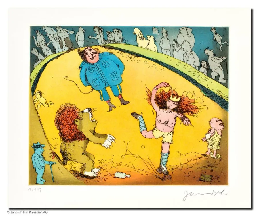 Janosch Der Löwe brüllt, es tanzt Marie, das Publikum ... Farbradierung Auflage 199 Ex. mit Passepartout 40 x 50 cm