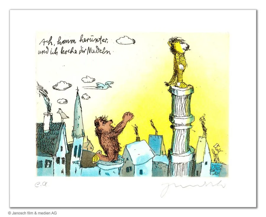Janosch Ach komm herunter und ich koch dir Nudeln Farbradierung Auflage 199 Ex. mit Passepartout 40 x 50 cm