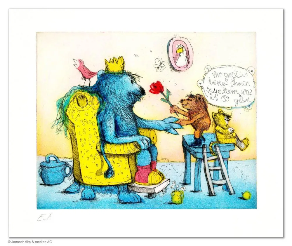 Janosch Wir gratulieren Ihnen zu allem was es so gibt Farbradierung Auflage 199 Ex. mit Passepartout 50 x 60 cm