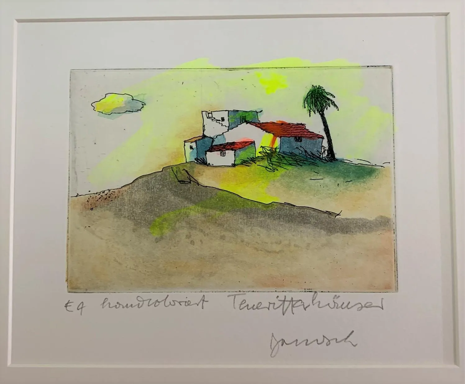 Janosch 4 Häuser und eine Palme handkolorierte Radierung im Echtgoldrahmen 30 x 40 cm (C) Janosch film & medien AG