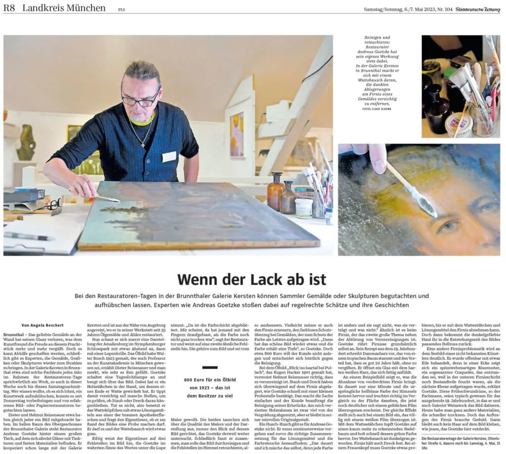 Wir veranstalten jedes Jahr Restauratorentage. Dabei bietet sich die einmalige Gelegenheit, einem Restaurator bei der Arbeit über die Schulter zu schauen und zu erleben, wie verstaubte und vergilbte Ölgemälde wieder in alter Schönheit erstrahlen. Gerne können Besucher den Zustand ihrer Kunstwerke unverbindlich prüfen lassen.
