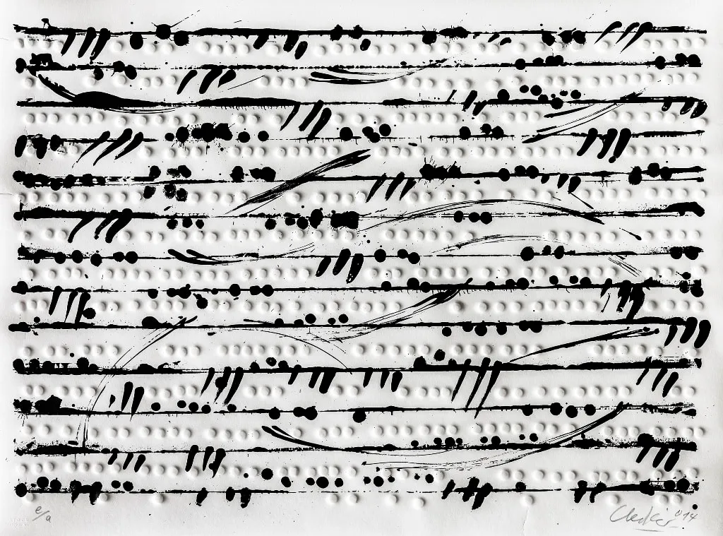 Günther Uecker Optische Partitur I, 2014 Prägedruck und Lithografie Maße 66,5 x 90 cm